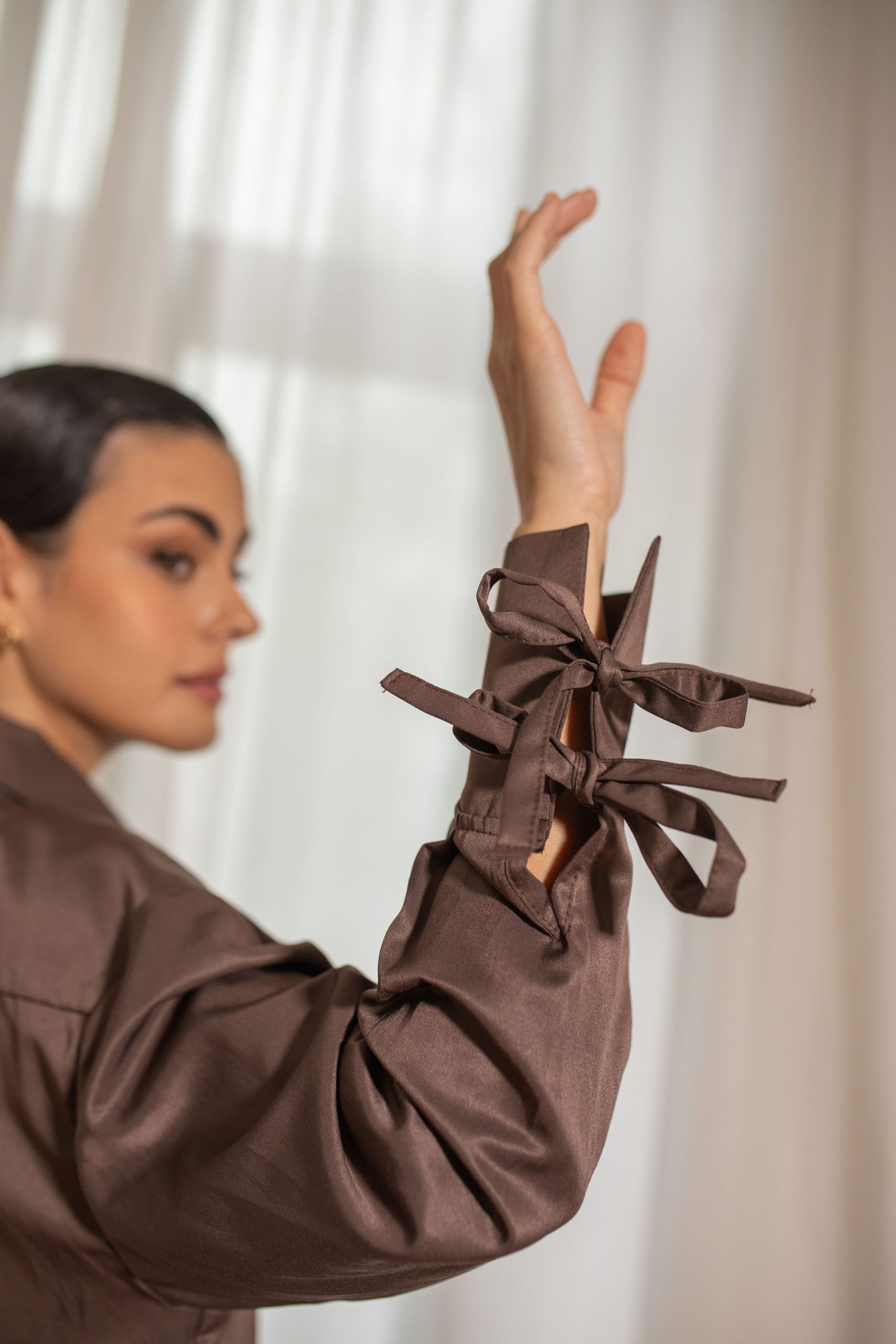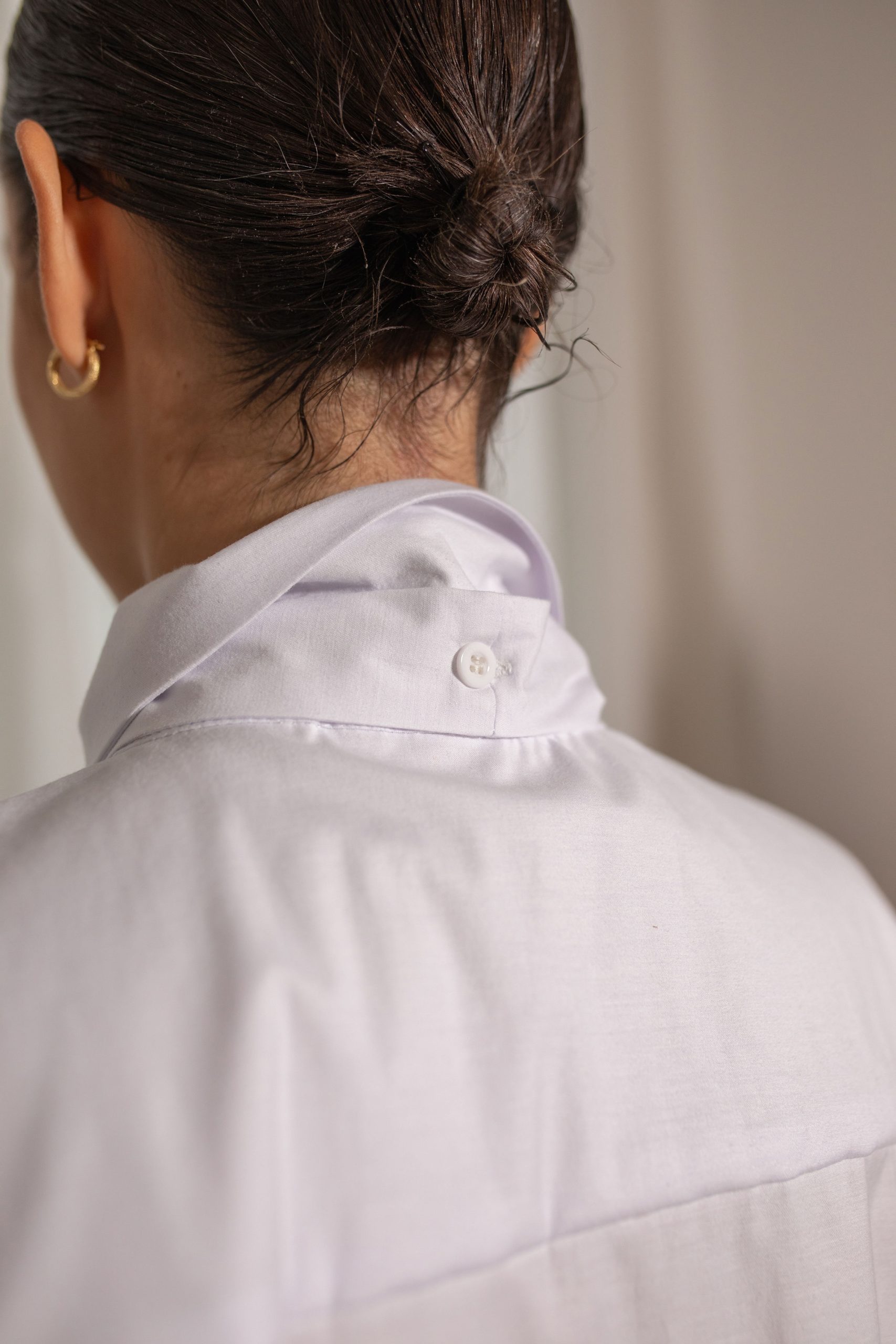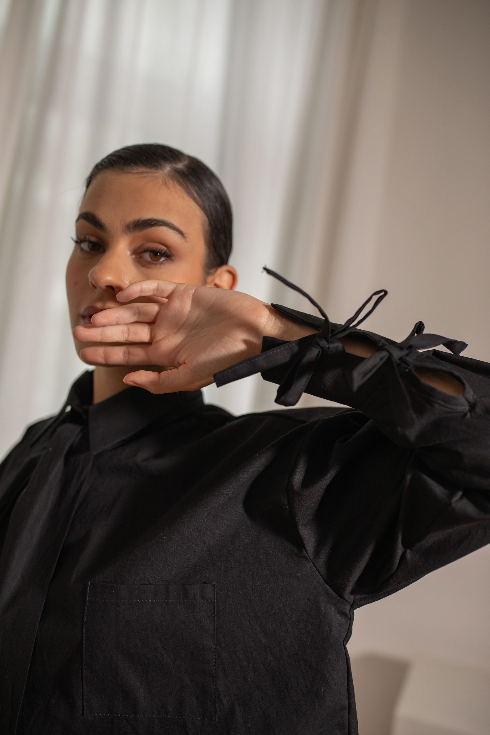 Želela sam košulju sa mašnom koja pruža mogućnost za igru, i izbor da li je želiš tu ili ne. Uz pomoć dugmenceta ispod kragne može se skinuti. Manžetne se umesto sa dugmićima takodje podešavaju mašnicama.