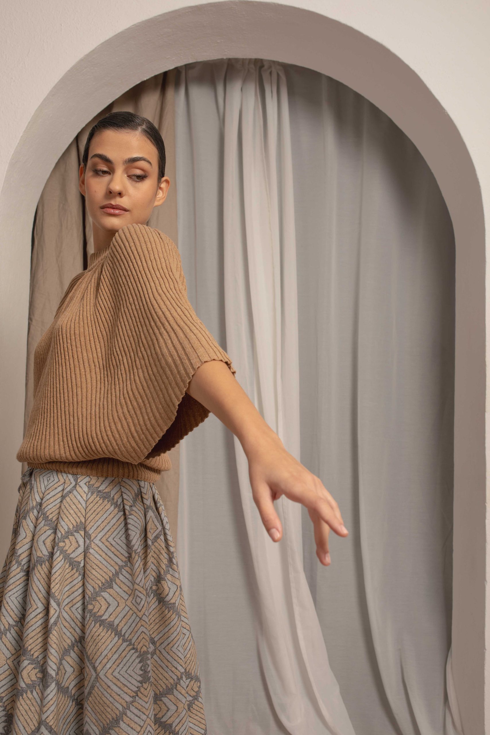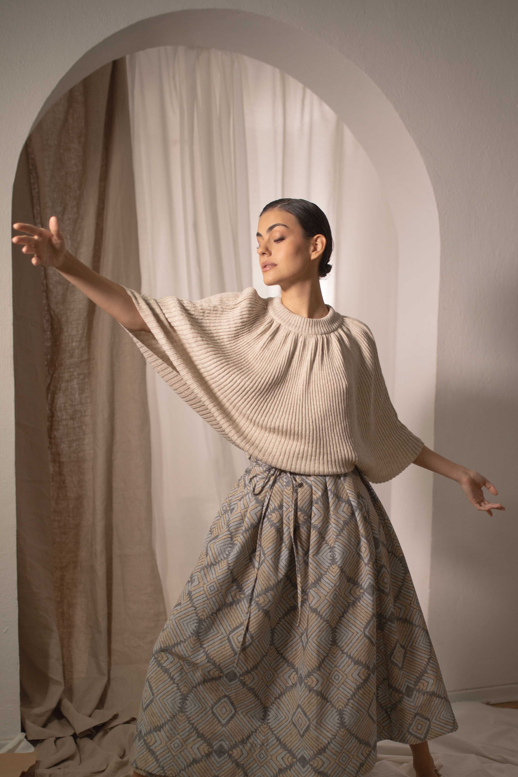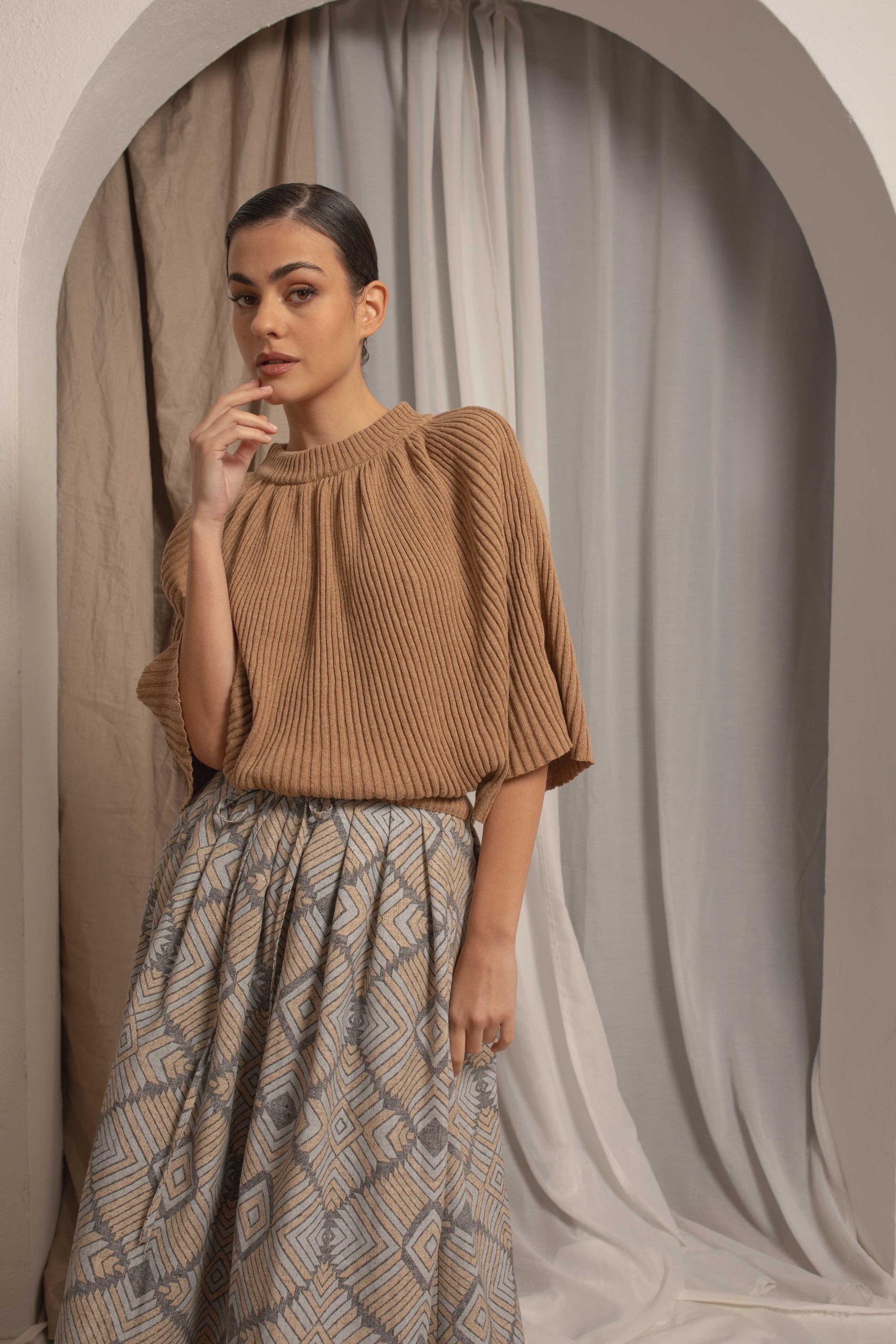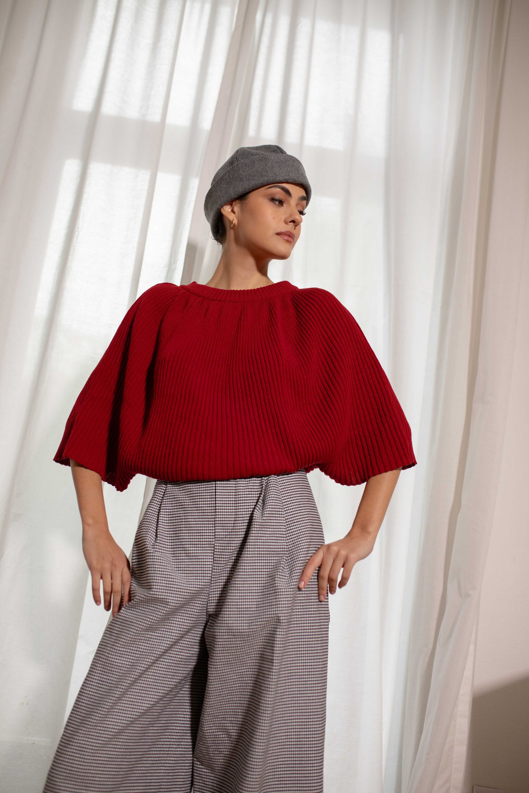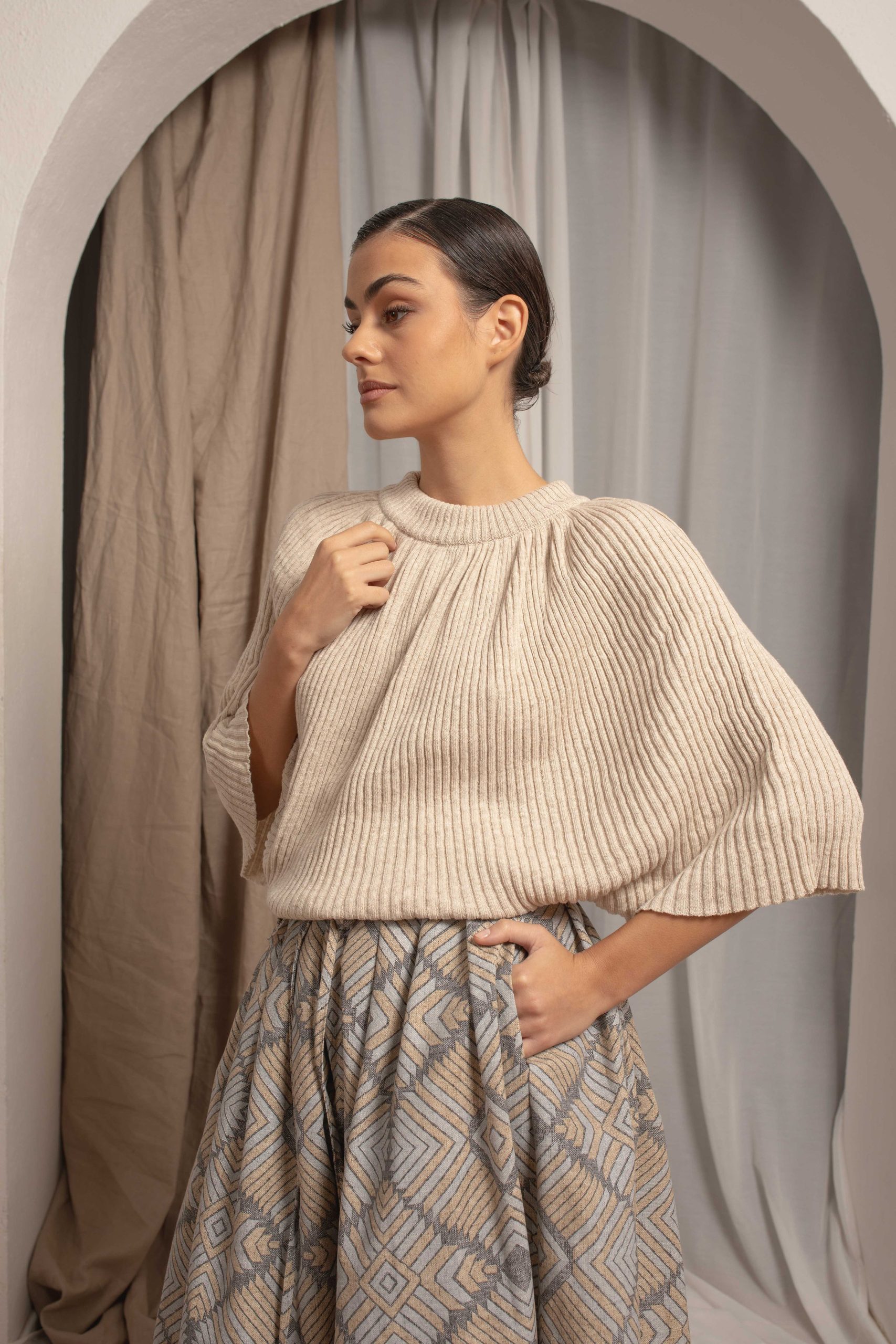 U donjem delu ima široku ranflu koja se lako oblikuje u predelu stomaka odakle pada i ima dramarične miš rukave. Rebraste je teksture. Idealan je za nošenje uz pantalone ili suknje visokog struka.