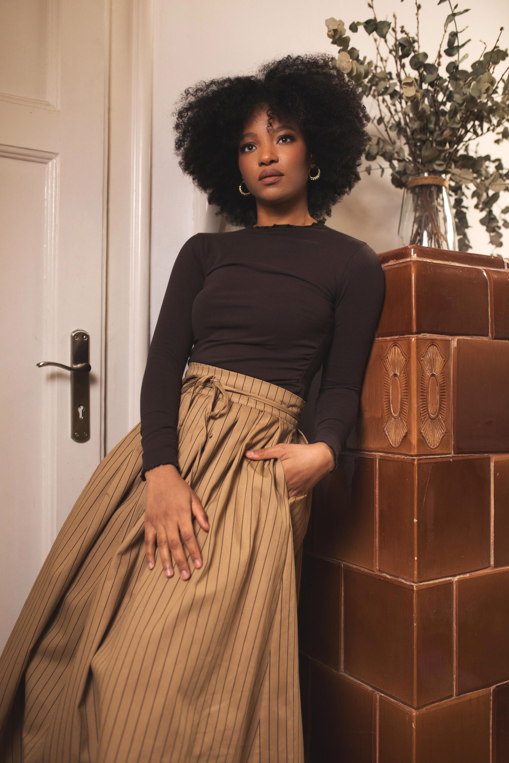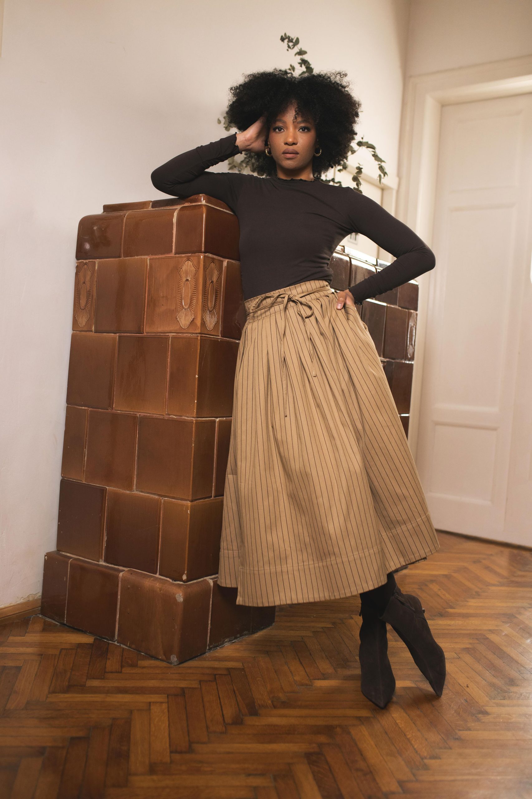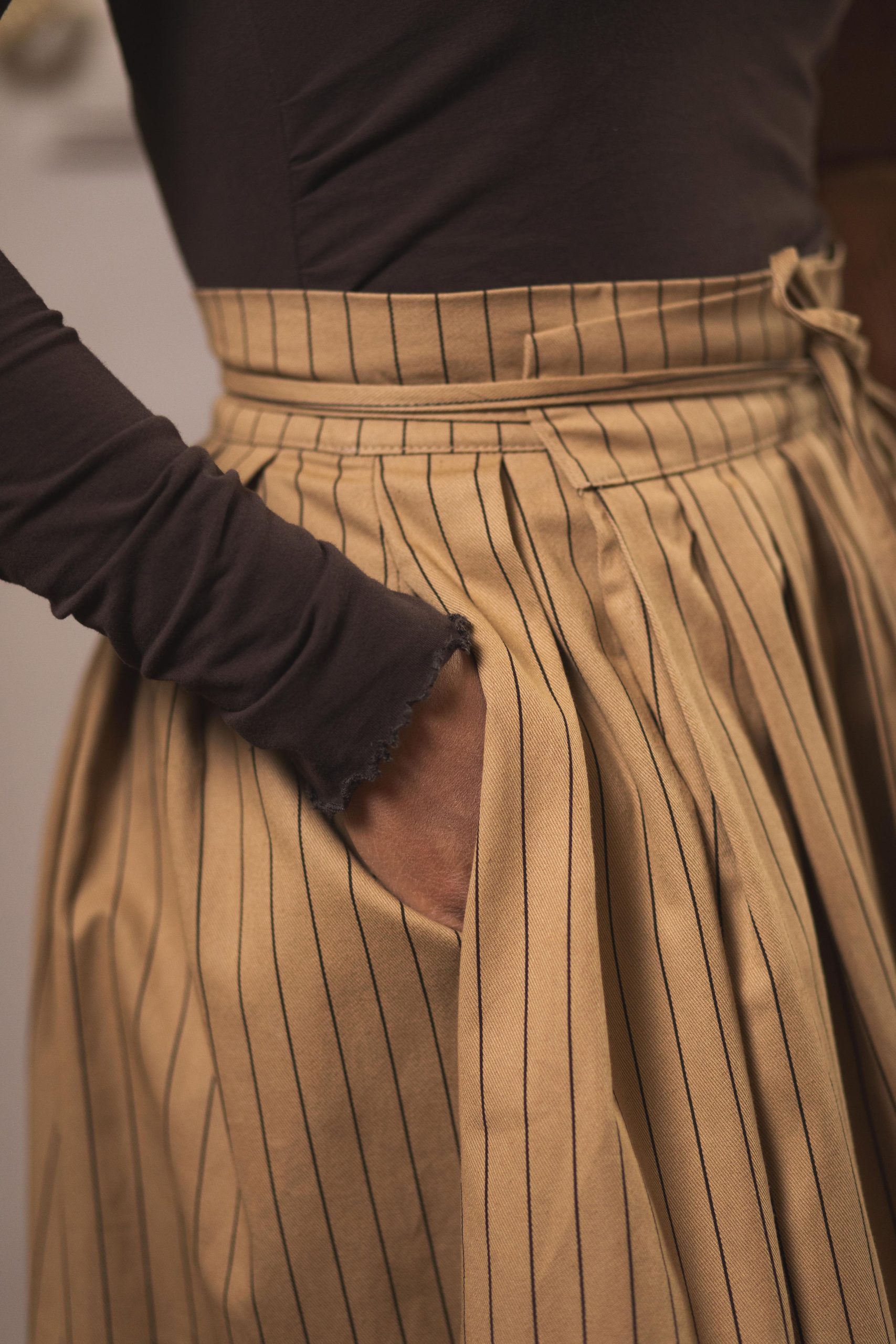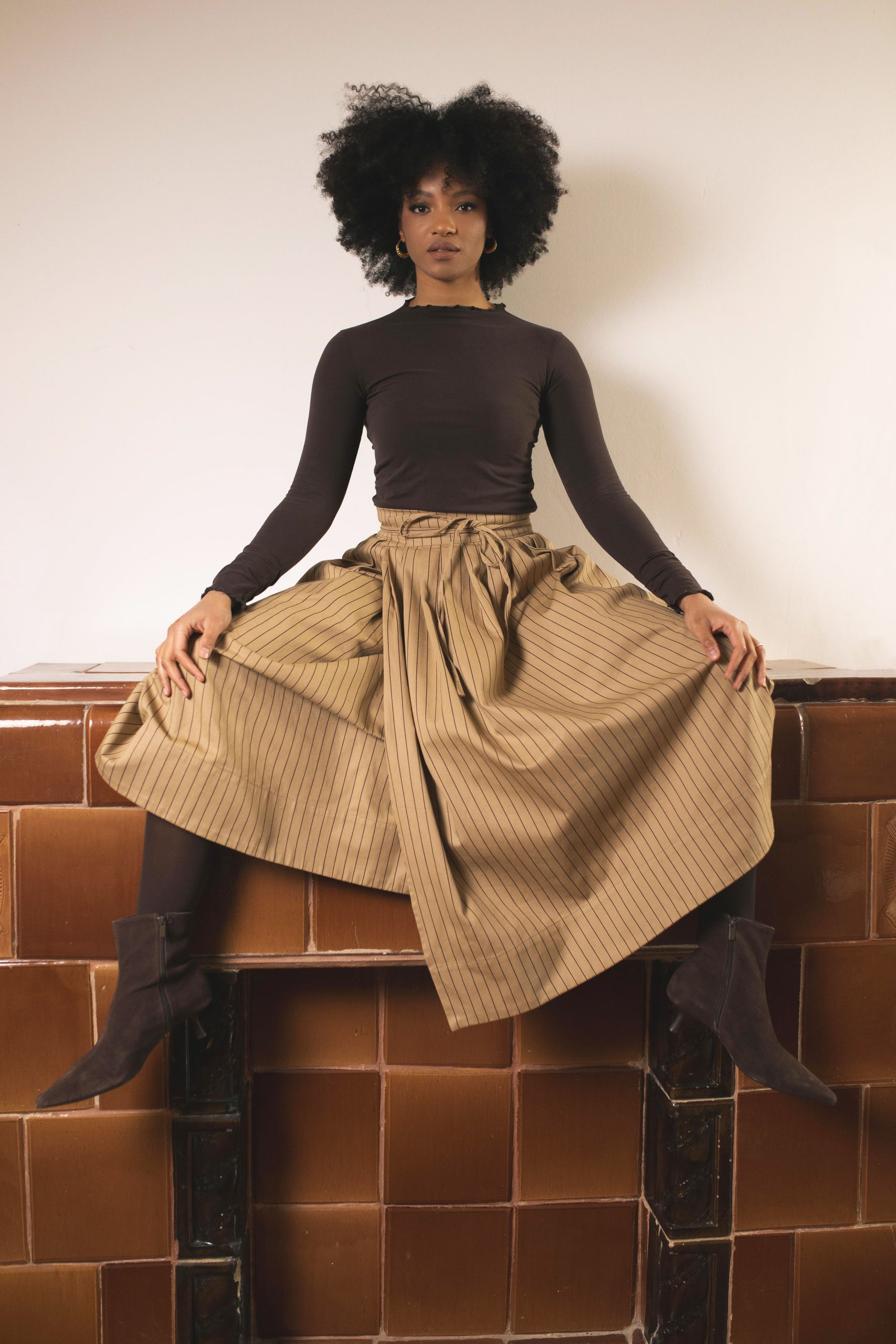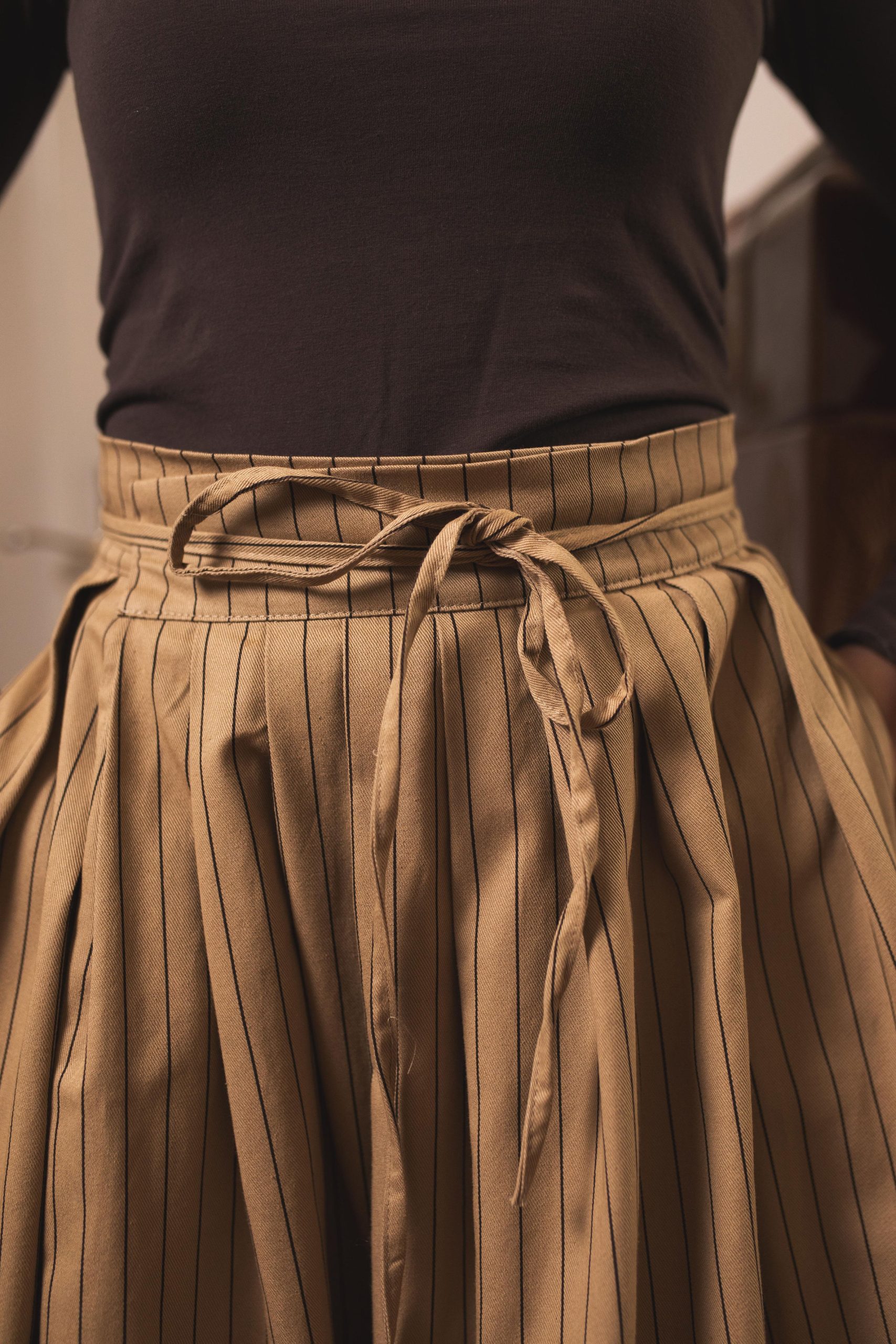 Tutu suknja u boji karamele sa tankim braon prugicama. Elegantna, otmena, classy.